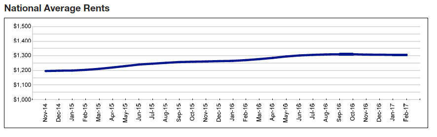 On a year-over-year (YOY) basis, rents were up 2.8% nationwide in February, down 40 basis points from January and roughly half the 5.5% growth rate of a year ago. Despite some fluctuation in between, rents are the same as they were in July 2016.