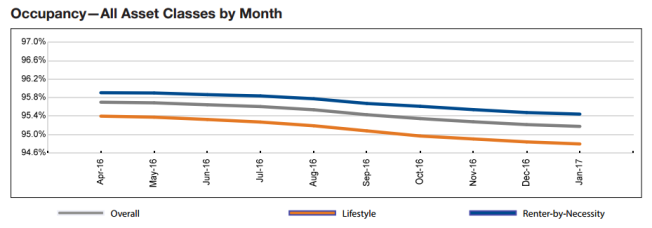 Most new units have been added at the high end. As a result, renter-by-necessity (RBN) occupancy outpaces lifestyle occupancy by 50 basis points.
