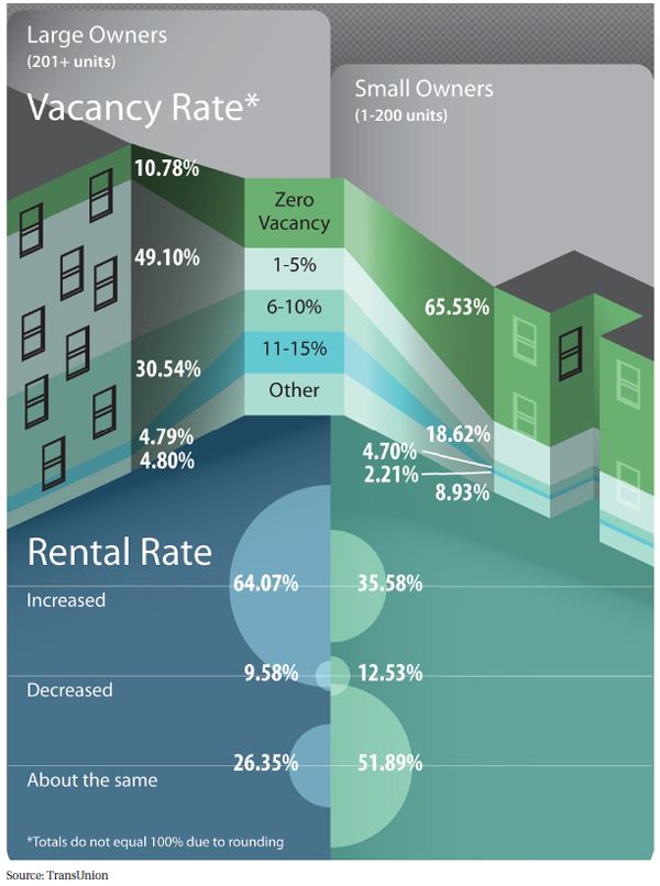 “The larger guys have made it a focus to increase rents in the regions where they’re able to,” says Steve Roe, vice president of TransUnion’s rental screening business unit. “The smaller guys are more content to fill the apartments and have good occupancy rates, as opposed to taking the next step, whether it’s reducing the number of concessions or pushing rents.”