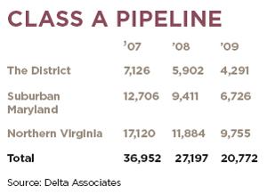 The Class A apartment pipeline in the metro’s three major markets—Northern Virginia, the District, and suburban Maryland— has shrunk considerably since ballooning to a total of 36,952 units in December 2007. As of June 2009, the total pipeline for the metro area totaled 20,772 units, with Northern Virginia, the District, and suburban Maryland decreasing by 43 percent, 40 percent, and 50 percent, respectively from their peaks, according to Alexandria, Va.-based research firm Delta Associates. The pipeline reduction has been mainly driven by the difficulty in obtaining construction financing, which has resulted in cancellations.