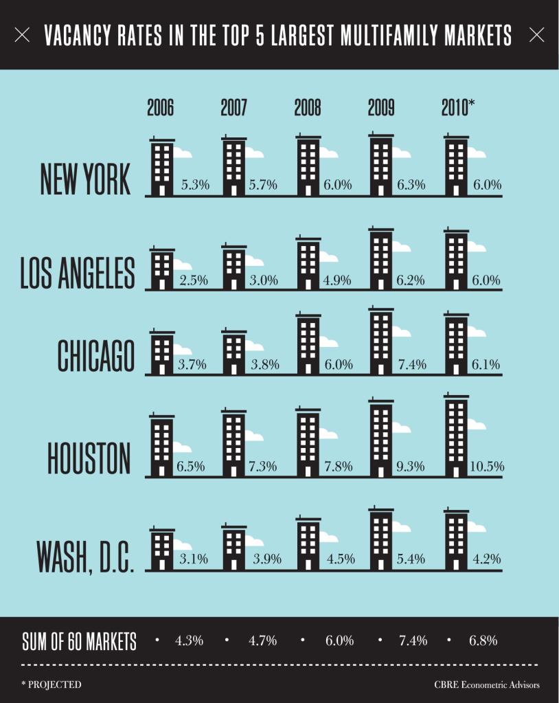 The worst could soon be over for the apartment industry—at least when it comes to rising vacancy rates. Vacancies are expected to hit an average of 6.8 percent this year—down from 7.4 percent in 2009—in 60 markets surveyed by New York-based research group CBRE Econometric Advisors (CBRE-EA).“We do expect vacancies to edge down in 2010 from the peak in 2009,” says Gleb Nechayev, vice president and senior economist for CBRE-EA (formerly CBRE Torto Wheaton). “That expectation is based on an expectation for job growth. It’s very important that we get tangible job growth in 2010.”