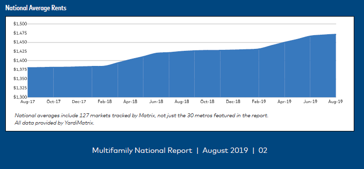 The average U.S. multifamily rent rose by $2 in August, up to $1,472, according to the latest Yardi Matrix Monthly Report. Year-over-year rent growth fell by 10 basis points from July, down to 3.3% in August.
