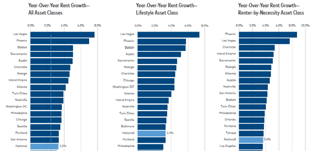 Overall, rent growth has remained consistent from month to month and has not fallen below 2.7% since the beginning of 2018. At the metro level, most major markets have seen healthy growth; Las Vegas leads the nation with 7.6% rent growth, followed by Phoenix at 7%.