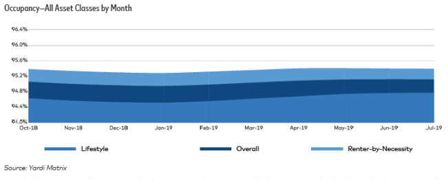 Occupancy rates of stable properties have fallen 10 basis points year over year, down to 95.1% as of July 2019. (Occupancy rate reports are current as of the previous month.) Baltimore’s occupancy rate is one of the most mobile, up 40 basis points over this period to 95%, coupled with a push to 2.9% rent growth YOY as of August.