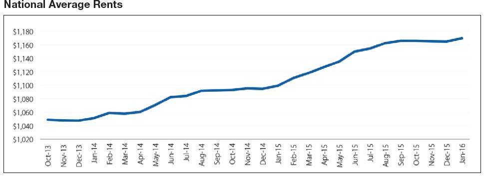 After a robust 2015, multifamily rents have seen a strong start to 2016, with an average national rental rate increase of $5, to an all-time high of $1,170 in January, according to a new Yardi Matrix report.