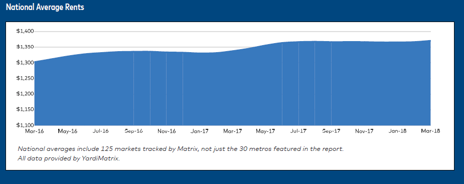 Yardi Matrix considers the market’s performance “decidedly mixed” in the past month, according to the latest Matrix Monthly report. Before March, the national average rent hadn’t risen or fallen more than $1 since July 2017, and the growing average rent stands out against an overall trend toward deceleration. However, concerns about peaking supply, affordability, and falling occupancy rates remain. About 620,000 new units have been added to the nation’s housing stock over the past two years, and the occupancy rate has fallen by 100 bps over the same period.