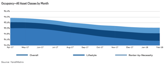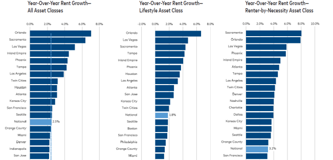 The nation’s “Renter-by-Necessity” (RBN) properties experienced 3.2% YOY rent growth, while “Lifestyle” properties experienced 1.8% YOY rent growth. The 140 bps spread between the two asset classes is exacerbated by the glut of new high-end supply on the market, Yardi notes.