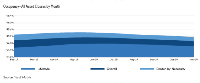 Year-over-year rent growth remained between 3% and 3.3% throughout 2019. Deliveries for the year total an estimated 300,000 new units, and the occupancy rate for stabilized properties was 94.9% in November. (Occupancy rates are current to the previous month.) The job market averages 180,000 new jobs per month, and the unemployment rate stands at 3.5%.