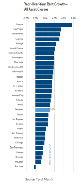 Sixteen of the nation’s major metros experienced negative T-3 rent growth, with San Jose at the bottom at -0.8%, followed by Denver at -0.5% and Orlando at -0.4%. Yardi notes that Orlando and Denver’s population growth has fallen off recently, possibly owing to affordability issues.