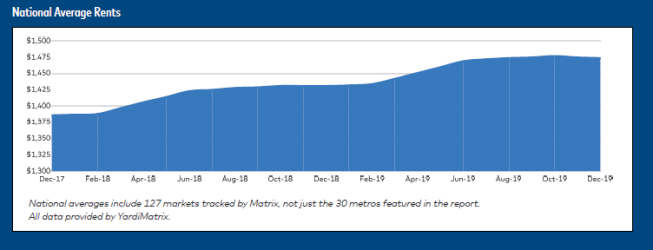 The national average multifamily rent fell by $1 in December 2019, down to $1,474 at the end of the year, according to Yardi Matrix’s latest Matrix Multifamily National Report. Year-over-year rent growth fell by 10 basis points to 3%—marking a solid performance for the year, according to Yardi.