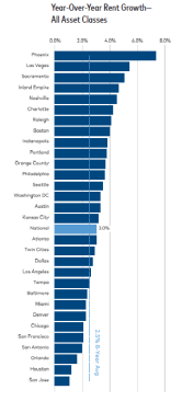 Year-over-year rent growth has risen in 16 out of the top 30 markets displaying growth above the national average, and no markets posted negative YOY rent growth. Phoenix leads the top markets with 7.4% YOY rent growth, followed by Las Vegas at 5.4% and Sacramento, Calif., at 5.1%. The top 10 markets are concentrated in the West and Southeast, with the exception of Boston at 4%.