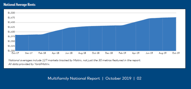 The national average multifamily rent rose by $1 to an all-time high of $1,476 in October, according to the latest Yardi Matrix Multifamily National Report. Over the same period, year-over-year rent growth remained steady at 3.2%. Yardi notes that year-over-year growth has remained above 3% for nearly a year.