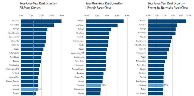 Phoenix remains the strongest market for YOY rent growth at 7.9%, followed by Las Vegas at 6.4%. Three Southeastern markets have reentered the top 10 for rent growth after a period of absorbing a high amount of new supply: Raleigh (5.1%), Charlotte (4.8%), and Nashville (4.6%). Of the 30 major markets covered in this month’s report, 17 saw YOY rent growth of at least 3.3%, and only two, San Jose and Houston, fell far below the 2.5% long term average at 1.2%.