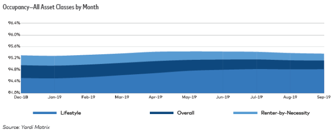 While Nashville and Austin (4.3%) have seen some seasonal weakness over the last 12 months, they are currently in a rebound due to strong demand. Nashville’s occupancy rate has risen by 60 basis points to 95.5% in September (all occupancy data is current to the previous month), and Austin’s has risen 20 basis points to 95%. Both metros absorbed more than 4.2% of stock in the last 12 months.