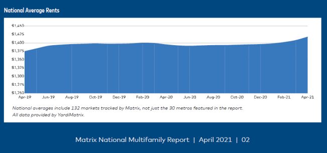 Multifamily rents rose by 1.6% year over year in April, according to Yardi Matrix’s latest Multifamily National Report—the largest YOY rent growth the market has seen since the start of the COVID-19 pandemic. On a month-to-month basis, overall rents rose by $10 to $1,417 in April, marking the sharpest overall rent increase since June 2015.
