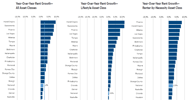 Out of the top 30 markets, 24 experienced month-to-month rent growth greater than 0.5%, led by Las Vegas at over 1%. All gateway markets posted positive gains; Miami leads rent growth in the gateway markets at 1% on a month-over-month basis, followed by Chicago at 0.9%, Boston and San Francisco at 0.8%, and New York at 0.6%.