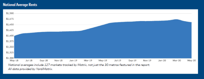 The national average rent fell by $5 to $1,460 May, marking a $13 total decline from March, according to Yardi Matrix’s latest National Multifamily Report. Overall, rents rose by 0.8% on a year-over year basis, compared with 3.5% YOY rent growth in May 2019.