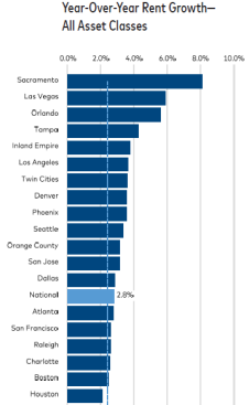 Two-thirds of the top 30 metros by multifamily rent growth are within 100 basis points (bps) of the national average, signifying metro-level rent growth that trends closer to the national median. Sacramento, Calif., sported the strongest YOY rent growth last month, at 8.1%, or over 220 bps above the next metro on the list, Las Vegas, at 5.9%.