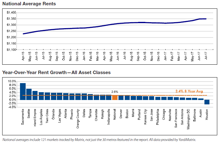 Despite virtually flat sequential rent growth and slowdowns still to be expected, the multifamily market remains healthy overall. Yardi notes that rent growth usually tends to moderate in the second half of the year, as it has in July. At the same time, rent-growth gains in the first half of 2017 have already placed the year at an above-average growth pace. The market is also coming down from last year’s unsustainably high rent-growth rates, which peaked at 5.6% in early 2016. By comparison, 2.6% hovers closer to the average YOY rent-growth rate.