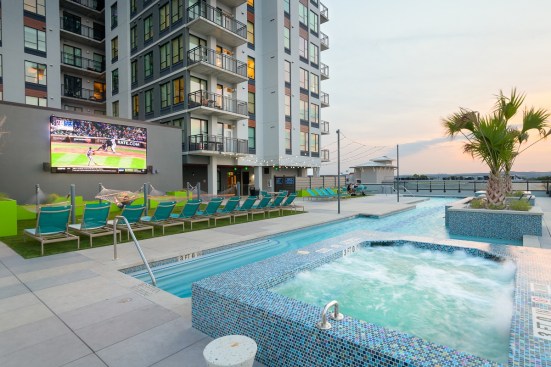 Packed with luxury amenities from the ground to the top, the seventh floor offers an all-inclusive pool deck with a Jumbotron. Situated directly adjacent to the pool, residents can enjoy prime-time sports or big television events from the water or from the comfort of several hammocks and lounge chairs. And for those looking for a more peaceful area, the team also added an array of hammocks to the fifth floor courtyards to allow students to relax outside and enjoy the warm Austin weather.