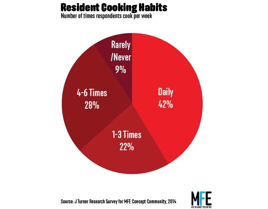 The kitchen is often a home’s heart, and apartment living is no different: 42 percent of respondents cook daily and another 28 percent cook four to six times per week.