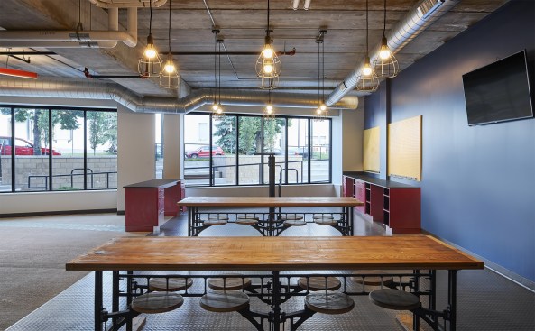 The designers chose to continue the community’s vibrant interior design style to the bike lounge with large colorful tire treads painted on the floors and walls in the bike storage area of the room. On the other half, large worktables with integrated stools provide space to work on bike parts, while also providing dual functionality as a maker’s space for residents with other hobbies.