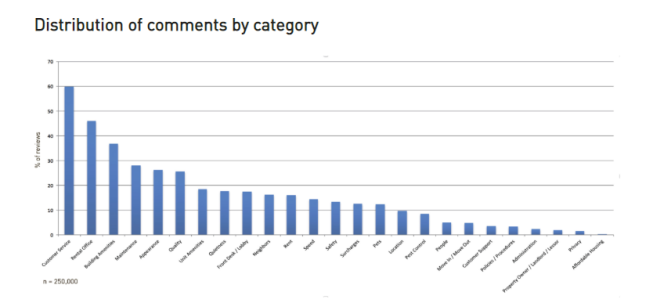 Roughly 60% of reviews mentioned customer service, including move in/move out and general tasks while tenants live on property. In fact, three of the top five review categories were all related to service with customer service first, rental office second, and maintenance fourth.