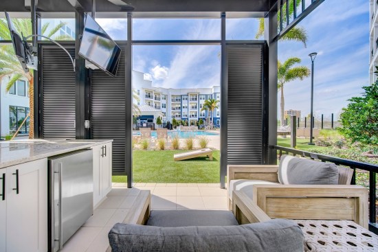 The property’s saltwater pool area, in particular, sits lakeside with a shaded pool pavilion, covered poolside cabanas, a fire pit and hammock grove, grilling stations, dining and lounging areas, and an easy-to-use, electric pizza oven. Made by barbecue manufacturer Cal Flame, the pizza oven is located under the pavilion, adjacent to the pool in the primary courtyard, and allows residents to craft their own homemade pizzas while lounging by the pool.