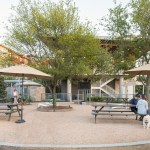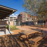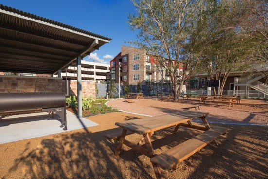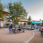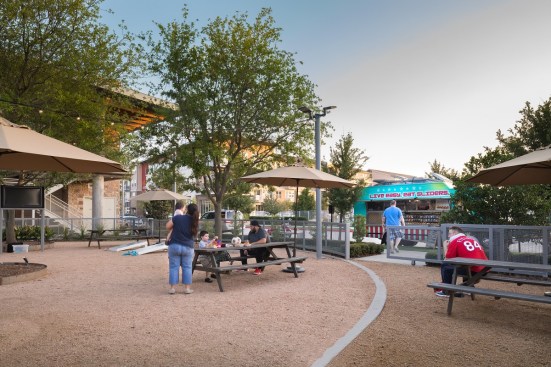 While the food trucks serve residents local fare, a gravel beer garden provides ample park-bench seating with umbrellas. In addition to the seating for truck customers, the roughly 4,000-square-foot garden includes televisions, lawn games, a smoker, a grill, and a kitchen prep area. The space is pet-friendly, like the rest of the community, and is landscaped with drought-tolerant plants. A canopy of trees creates a shaded setting during the day and offers hanging space for stringed lights at night.