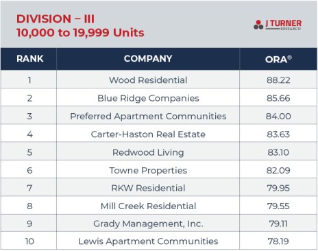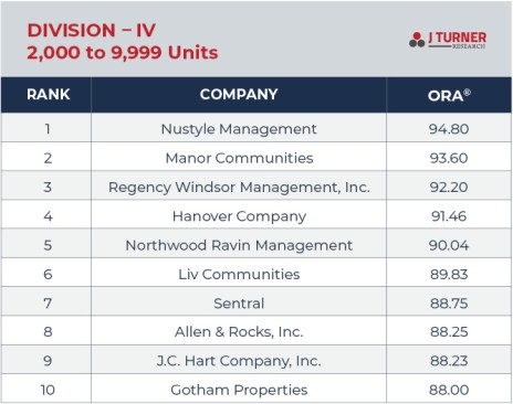 J Turner Research introduced the Division ORA Power Ranking to extend the ORA award recognition to management companies of all sizes. The top 10 companies with the most stellar online reputation in each division are listed below. To view the top 25 companies in each division, visit www.jturnerresearch.com/july-division-ora-power-rankings-2022.