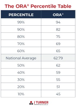 J Turner Research monitors over 128,000 properties nationwide for online ratings and reviews to determine individual ORA scores for each property. The national average ORA score is 62.79.