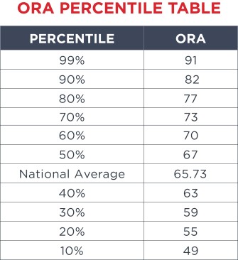The current national average ORA is 65.73. The average score of the top 10 student housing managers for 2020 is 74.85.