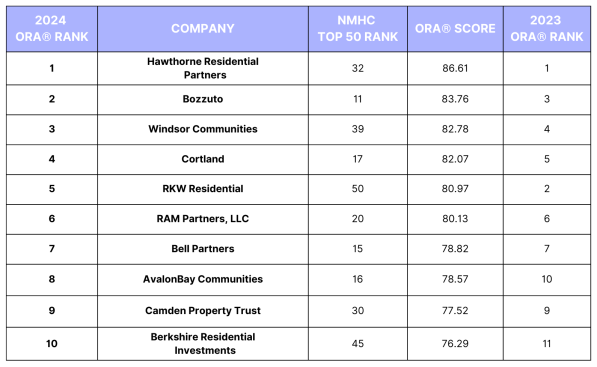 Bozzuto ranked second with an ORA score of 83.76, followed by Windsor Communities with an ORA score of 82.78.