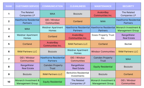Bozzuto ranked second in the top 10 managers list with an ORA score of 82.80, followed by Windsor Communities with an ORA score of 82.56.