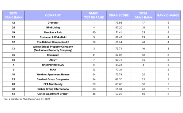 The table below lists the 2025 NMHC top 50 managers who have made the most significant improvement in their ORA scores from April 2024 to April 2025.