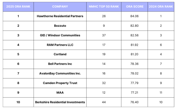J Turner Research announces the 11th annual Division I ORA Power Ranking—the top 10 of the 2025 National Multifamily Housing Council’s 50 Largest Apartments Managers ranked by their Online Reputation Assessment (ORA) scores. Congratulations to Hawthorne Residential Partners, the No. 1 manager with the best online reputation in the nation for the fourth consecutive year. Hawthorne’s companywide ORA score is 84.06.