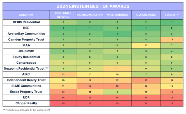 To determine these awards, J Turner Research utilizes its categorization tool, Einstein, to rank the multifamily REITs based on an aggregation of their open-ended feedback left within reviews in 2024. Using our proprietary AI Thought Analysis, all open-ended feedback is categorized into 22 operational categories specific to the multifamily industry. Having analyzed over 8 million reviews, Einstein provides unparalleled access into the quality of REITs’ operations focused on five key operational aspects.