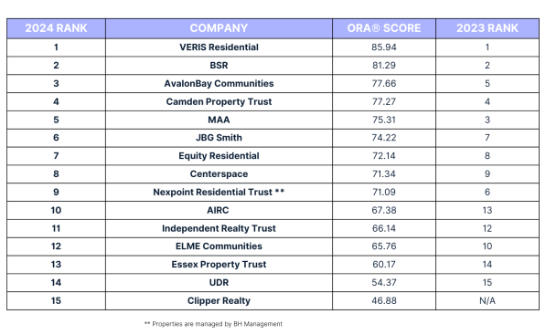 This is the 11th annual multifamily REIT ranking based on ORA scores. For a complete list of the top REITs by ORA, refer to the table below.