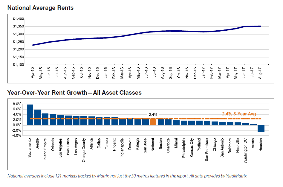 The average U.S. monthly rent rose by $1, to $1,352, in August, remaining essentially flat as apartment completions begin to slow across many of the 121 markets in Yardi Matrix’s Matrix Monthly survey. Meanwhile, the national rent-growth rate fell to 2.4%, down 20 basis points (bps) from July. (Despite these slowdowns, rents have increased every month this year.) Economic conditions and multifamily demand remain strong.