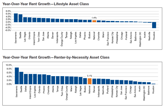 On a trailing 12-month basis (T-12), rents grew 3.1% YOY last month, down 10 bps from July. RBN rent growth (4.1%) outpaced Lifestyle rent growth (1.9%) on this scale. Lifestyle rent growth has fallen below 2% on a T-12 basis for the first time since 2011. Sacramento, Calif., remains the strongest market, at 9.6% growth on a T-12 basis.
