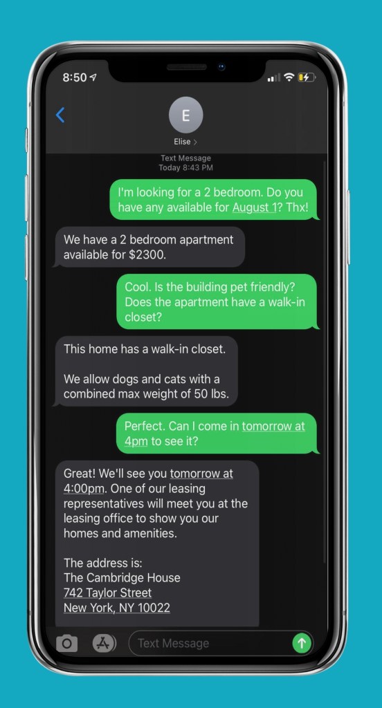 The MeetElise program uses machine learning to handle communications between apartment operators and prospective residents. It can be integrated seamlessly with existing property management software, and provides instant answers to prospective residents’ questions. This, according to the company, reduces the complexities involved in communications between potential renters and leasing offices, particularly as COVID-19 has necessitated vast changes to the touring and leasing process.