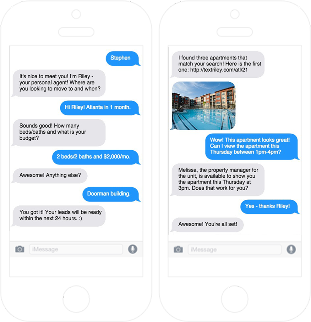 Riley launched the service, called TextRiley, at the end of June in hopes of reaching renters, especially millennials, in the way they most prefer communicating. Hunters simply text their name to a phone number to initiate a conversation about what they’d like to see in an apartment. The robot on the other end asks for specifics, such as ZIP codes, square footage, and number of bedrooms or bathrooms, to determine what the consumer is seeking.
