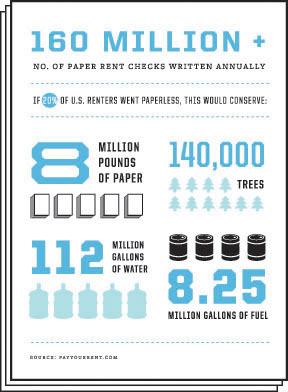If you think offering electronic rent payments only helps you and your residents, then you’ve forgotten about Mother Nature. Turns out if 20 percent of the U.S. rent-paying population ditched their checks and paid their rent online, this would conserve roughly 8 million pounds of paper; 140,000 trees; 112 million gallons of water; and 8.25 million gallons of fuel, according to research by Beverly Hills, Calif.-based PayYourRent.com.
