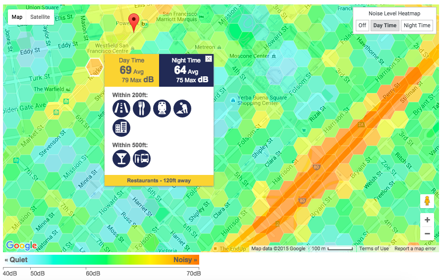 The measurement, which ranges from 40db to 70db, can be viewed on a Google map. Website users can type in a ZIP code and see a city overlaid with colored hexagons ranging from blue to orange to find the quiet and noisy areas, respectively. When users click on each hexagon, which covers roughly half a city block, a data box pops up with information such as the average decibel level and noise sources within 200 feet, 500 feet, and the vicinity. Users can also switch to a night view to see the difference in noise levels between daytime and nighttime. The average noise level, map, and possible noise sources also appear on each apartment listing located in a major U.S. city.