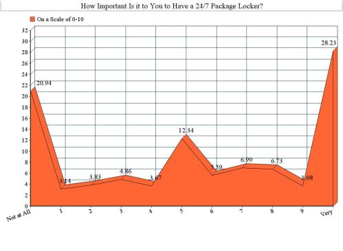 For many residents, that amenity is quite a hit: Access to a 24/7 package locker has become a factor in residents’ satisfaction with their apartment community. When asked how important package lockers were to them (on a scale of 0 to 10), 28.23% of renters rated them at the top—”very important”—with the clear majority indicating a preference for such on-site storage devices.